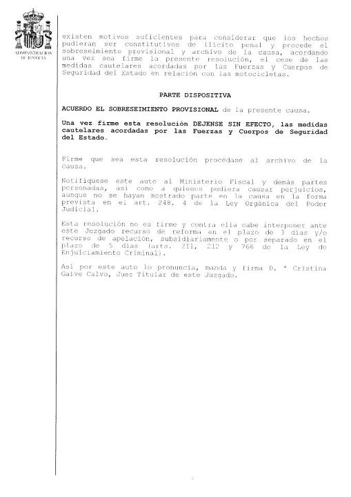 Pero ahora la juez ha determinado que si ese delito hubiese existido, algo que no se ha probado, ninguna de las personas implicadas tenía la condición de "autoridad o funcionario público", por lo que no existe "falsedad ideológica". Es decir, como mucho lo denunciado podría ser una "infracción administrativa" y no "un ilícito penal". Por esta razón, señala la titular del juzgado, "procede el sobreseimiento provisional y archivo de la causa", así como "el cese de las medidas cautelares acordadas [el precinto de las motos".